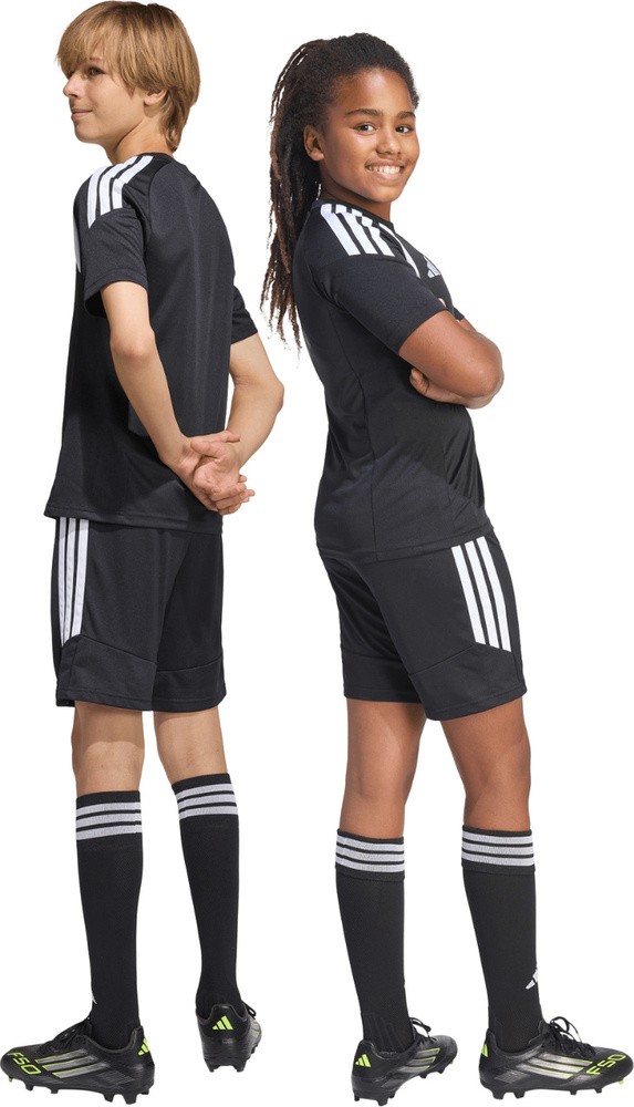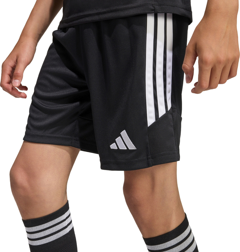 Spodenki dla dzieci adidas z linii Tiro łączą w sobie nienaganny styl i wydajność, by nadążyć za piłkarskimi ruchami.