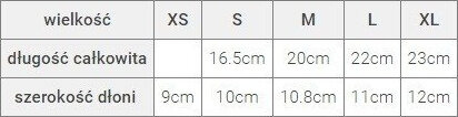 Aby ułatwić wybór rozmiaru podajemy szerokość ochraniacza (ręka po zaciśnięciu pięści powinna się mieścić w napięstniku, a więc być o ok. centymetr węższa) XS - 9 cm S - 10 cm M - 10,5 cm L - 11 cm XL - 11,5 cm