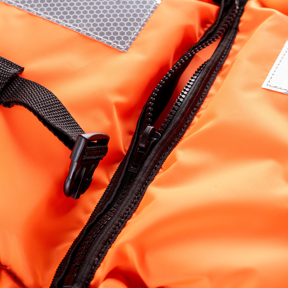 Kamizelka posiada pas krokowy, który zapobiega ześlizgnięciu się kamizelki po wpadnięciu do wody.