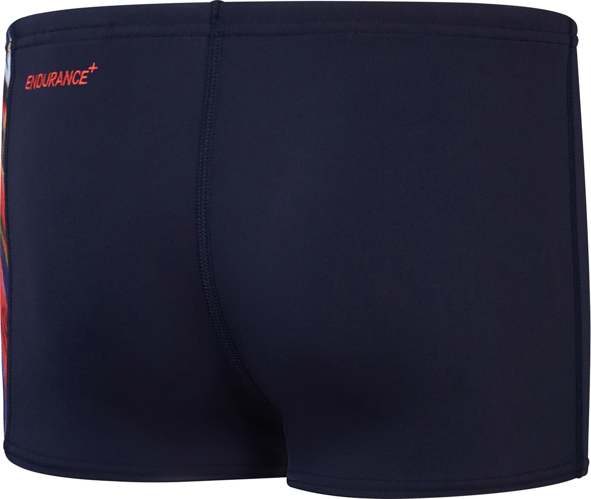 Pluskaj, nurkuj, trenuj w tych dostosowanych do wodnych przygód, granatowych, gładkich bokserkach kąpielowych, które charakteryzują się efektowną boczną wstawką z kolorowym wzorem inspirowanym miejską sztuką.