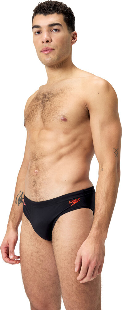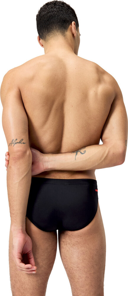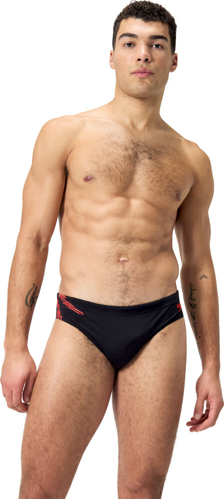 Wyglądaj profesjonalnie podczas treningu, nosząc czarne slipy kąpielowe tech 7cm brief z subtelnym nadrukiem w odcieniach czerwieni i szarości.