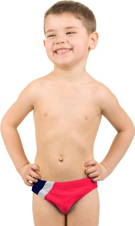 Trójkolorowe, chłopięce slipy pływackie ze wstawką, mniej elastyczna guma, ściągane sznurkiem. Średni podkrój nogawek, klasyczny wygląd, Wysoka jakość i wykonanie.