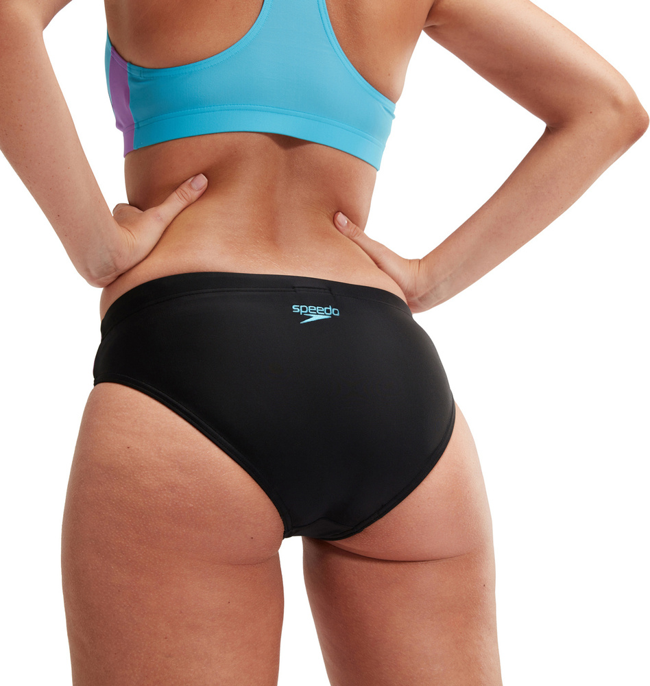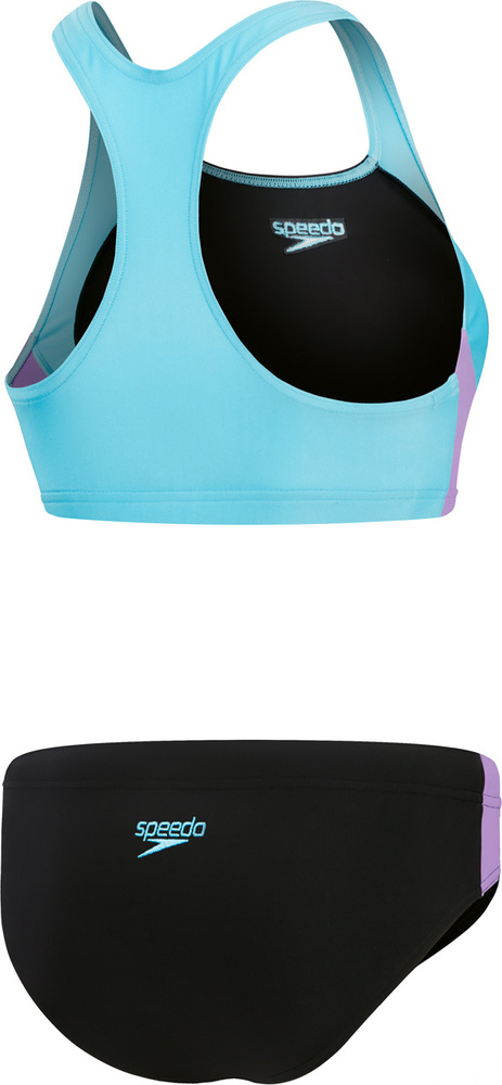 Dodaj odrobinę stylu do swojego pływania w tym sportowym dwuczęściowym stroju kąpielowym charakteryzującym się atrakcyjnym, kolorowym panelem bocznym.