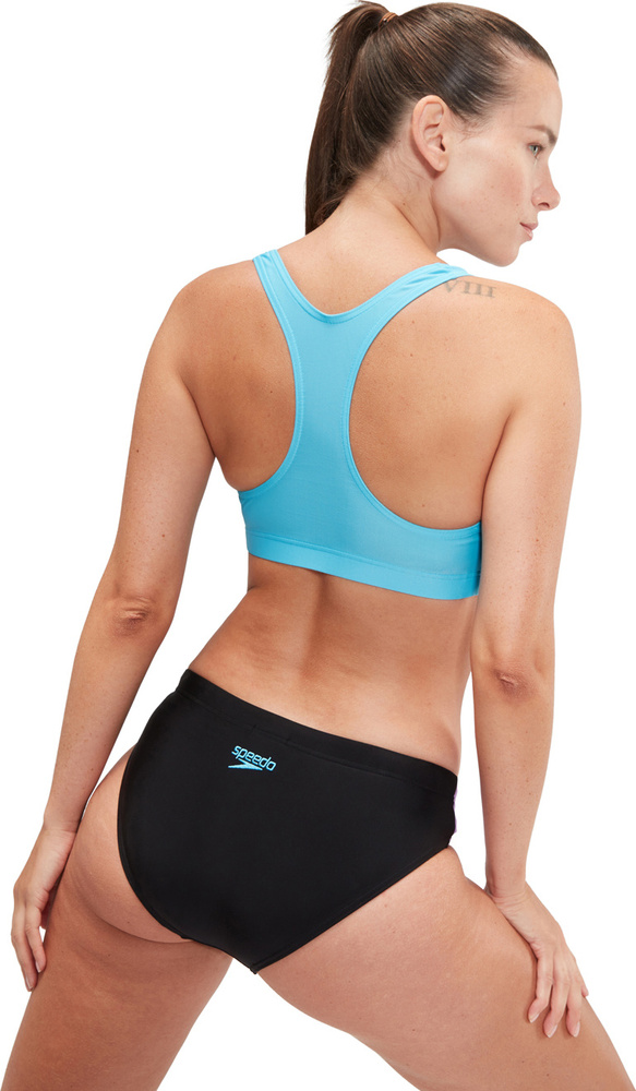 Dodaj odrobinę stylu do swojego pływania w tym sportowym dwuczęściowym stroju kąpielowym charakteryzującym się atrakcyjnym, kolorowym panelem bocznym.