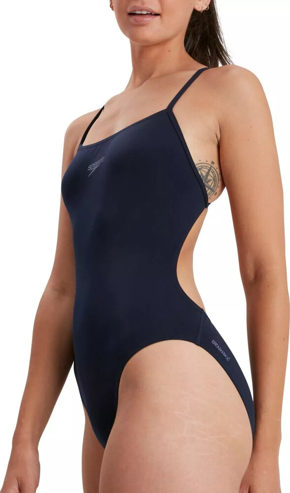 Szeroko otwarty tył i cienkie paski zapewniające nieograniczony ruch ramion oraz nogawka o wysokim kroju zapewniającym maksymalną elastyczność podczas treningu, są teraz wykonane w 50% z materiałów pochodzących z recyklingu.