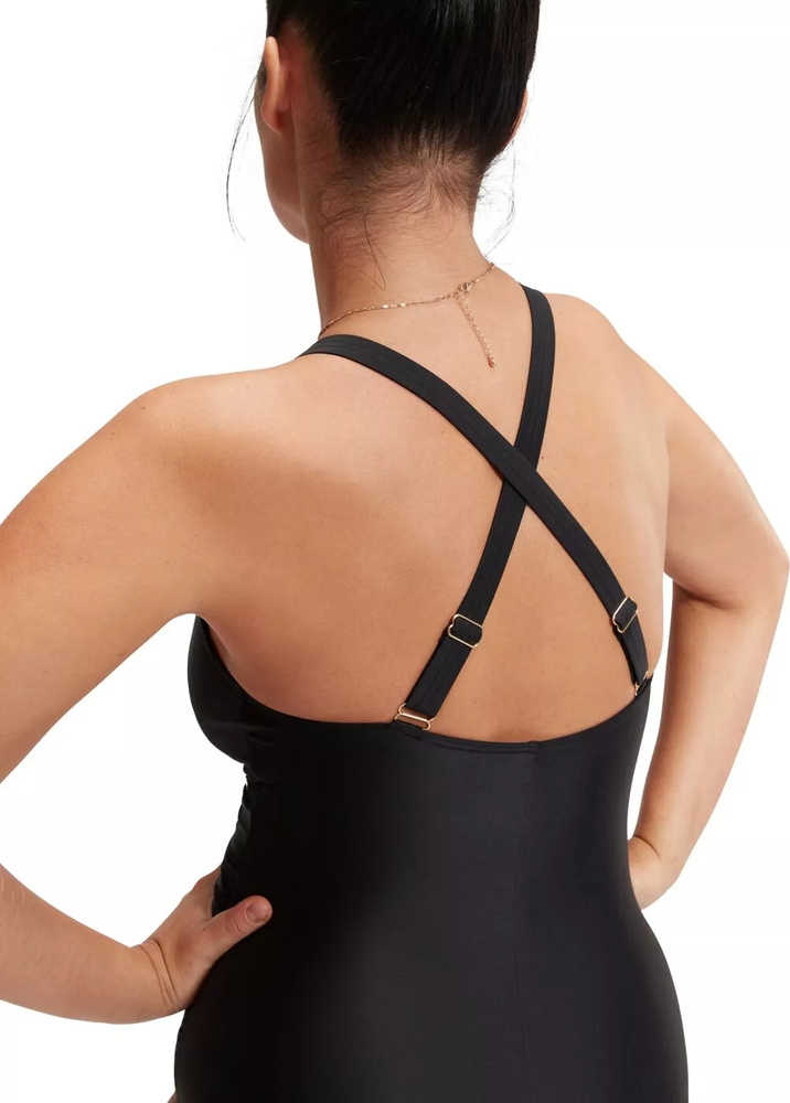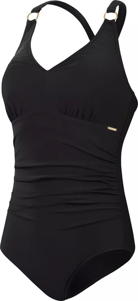 Pokochaj swój wakacyjny wygląd w tym nowym czarnym kostiumie shaping z pięknym dekoltem w kształcie litery v i przemyślanymi, podkreślającymi figurę marszczeniami.