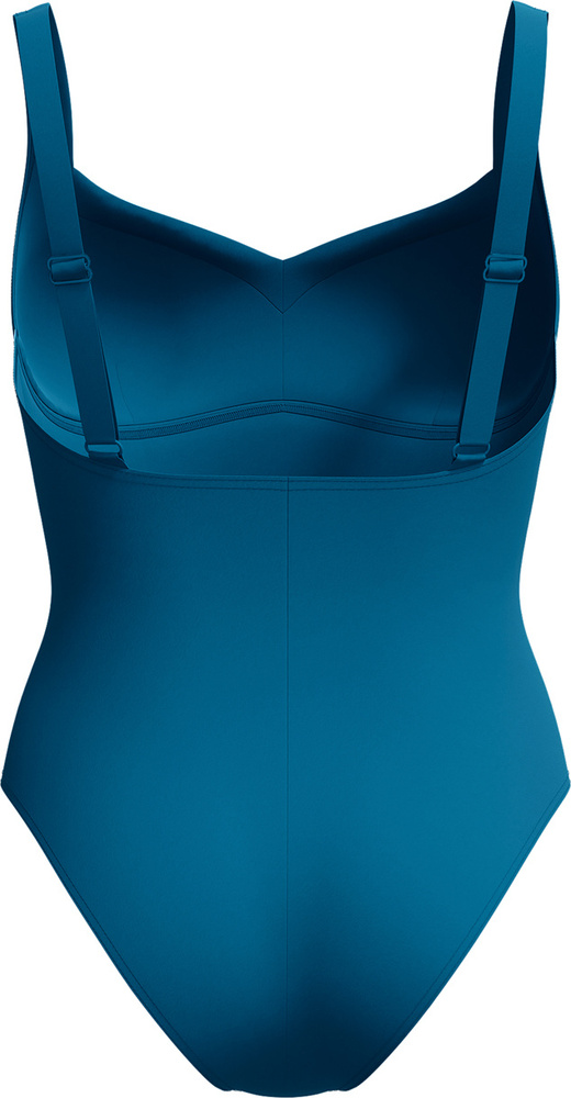 Jednoczęściowy kostium kąpielowy w kolorze teal z dekoltem w kształcie serca, zaprojektowany z myślą o podkreśleniu krągłości i konturów ciała.