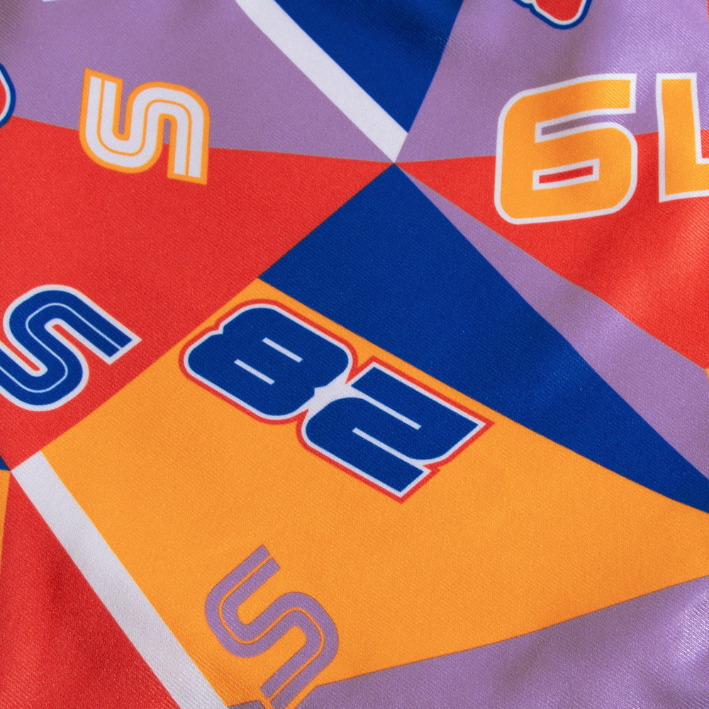 Przebijaj się z pełną prędkością w tym stroju kąpielowym vback, ozdobionym kolorowym retro nadrukiem inspirowanym malowaniem samochodów wyścigowych.