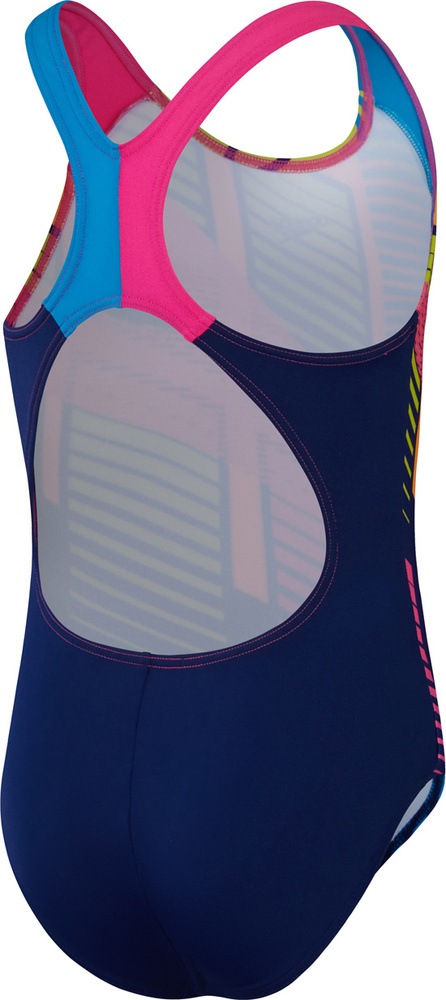 Krój tego kostiumu kąpielowego charakteryzuje się ramiączkami ustawionymi z dala od ramion, co zwiększa swobodę ruchów i pozwala młodym pływakom trenować bez uczucia ograniczenia.