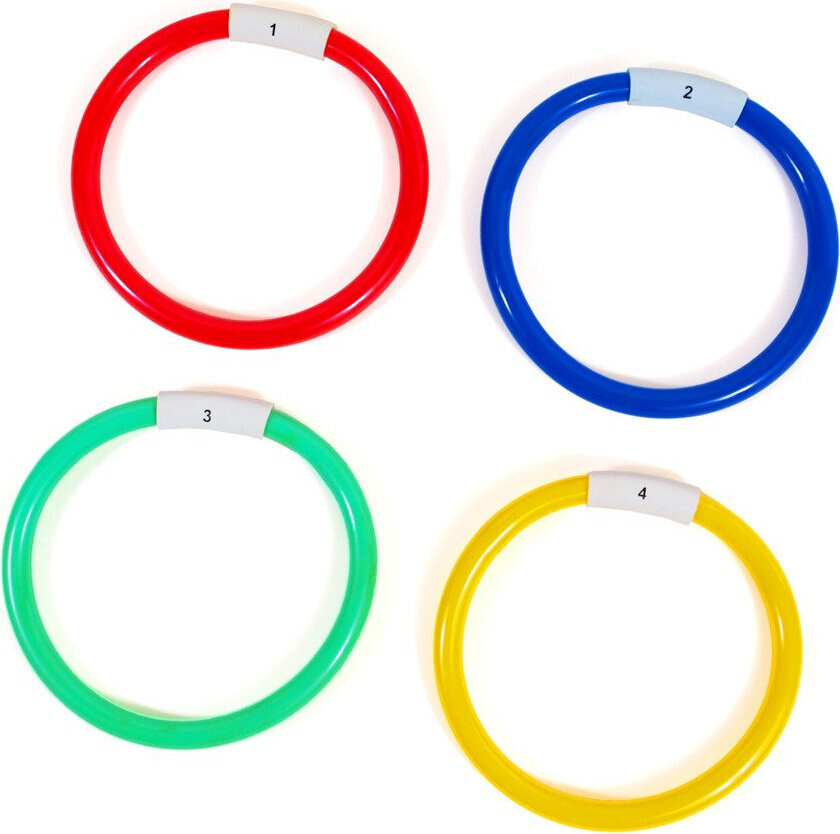 Zestaw czterech kół do wyławiania z dna basenu, stosowanych podczas nauki nurkowania lub zabaw wodnych dla dzieci.