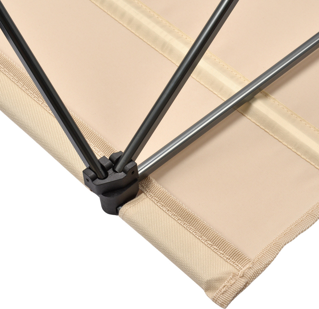 Szerokie zakończenia nóżek oferują dodatkową stabilność na nierównym terenie. Krzyżowany stelaż sprawia, że, stolik bez problemu udźwignie obciążenie do 15 kilogramów.