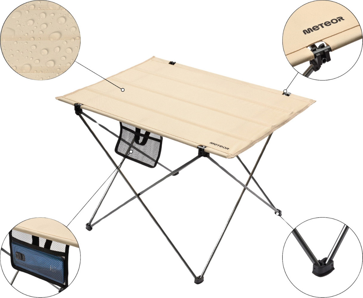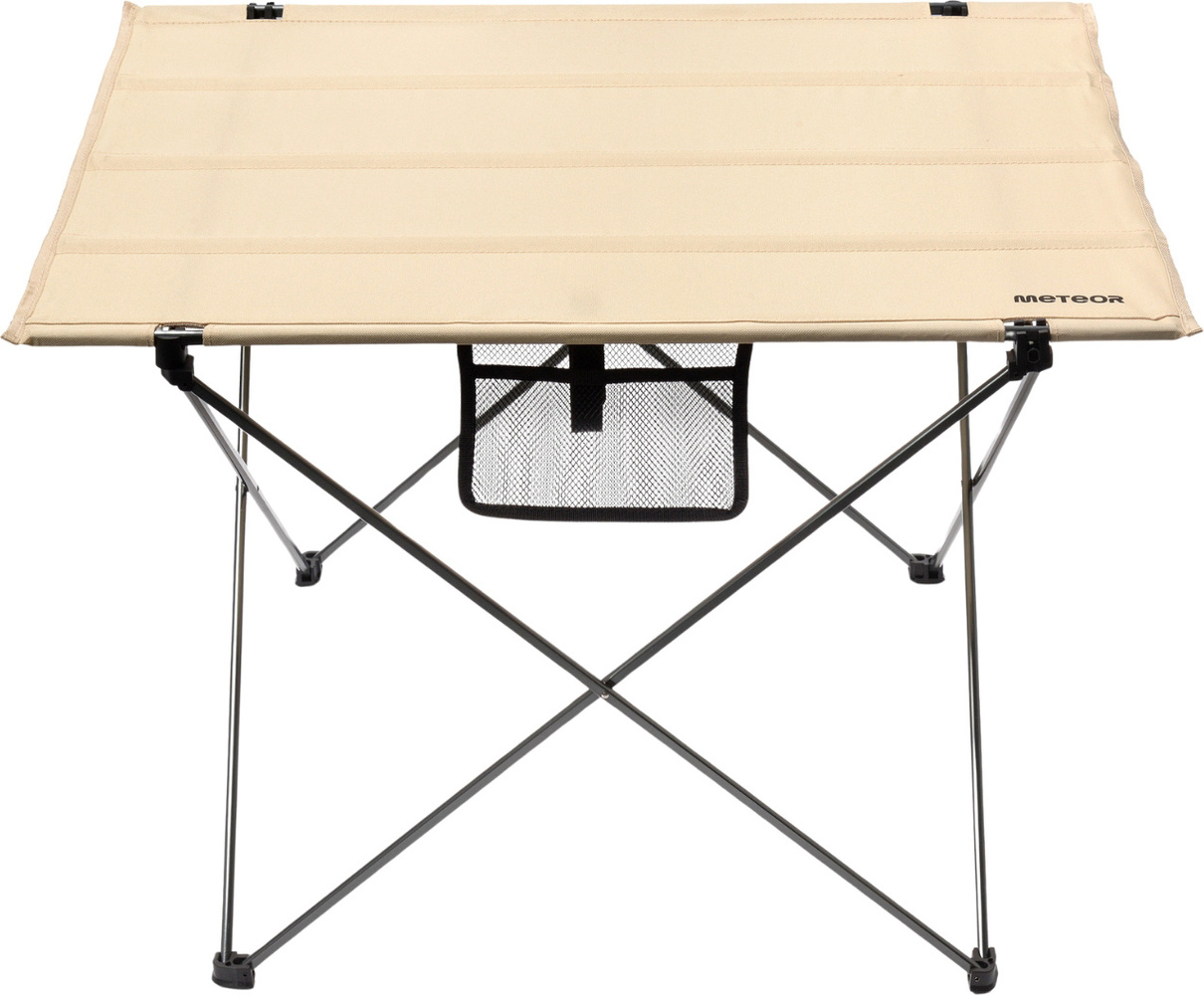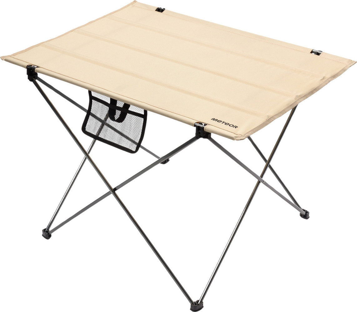 Kompaktowe rozmiary oraz niewielka waga sprawiają, że stolik bez trudu zmieści się w bagażniku samochodu czy plecaku, a dołączona torba z rączką umożliwia łatwe przenoszenie Dane techniczne:· Wysokość: 52 cm· Rozstaw nóżek: 55 / 55,5 cm· Wymiary blatu: 75x54 cm· Wymiary kieszonki: 18x12 cm· Wymiary po złożeniu: 74x9x6 cm· Średnica nóżek: 2 cm, 3 cm· Materiał: poliester Oxford 600D, Aluminium· Maksymalne obciążenie: 15 kg· Zestawy turystyczne Meteor zostały stworzone z myślą o wykorzystaniu na świeżym powietrzu podczas wyjazdów kempingowych, w ogrodzie lub na łonie natury.