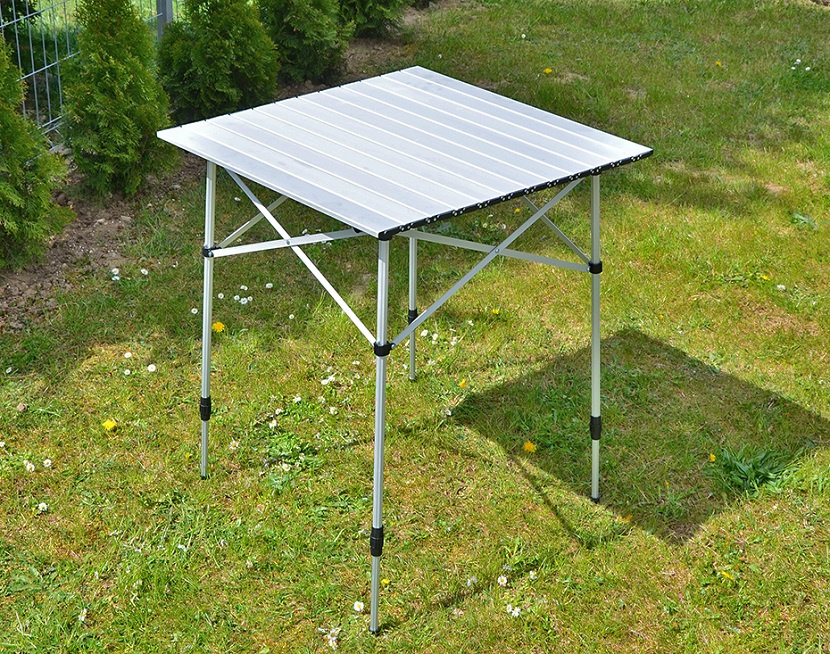 Dane techniczne:· Wymiary blatu: 70 x 70 cm· Wysokość regulowana: 70 do 85 cm· Nóżki: 19mm aluminium