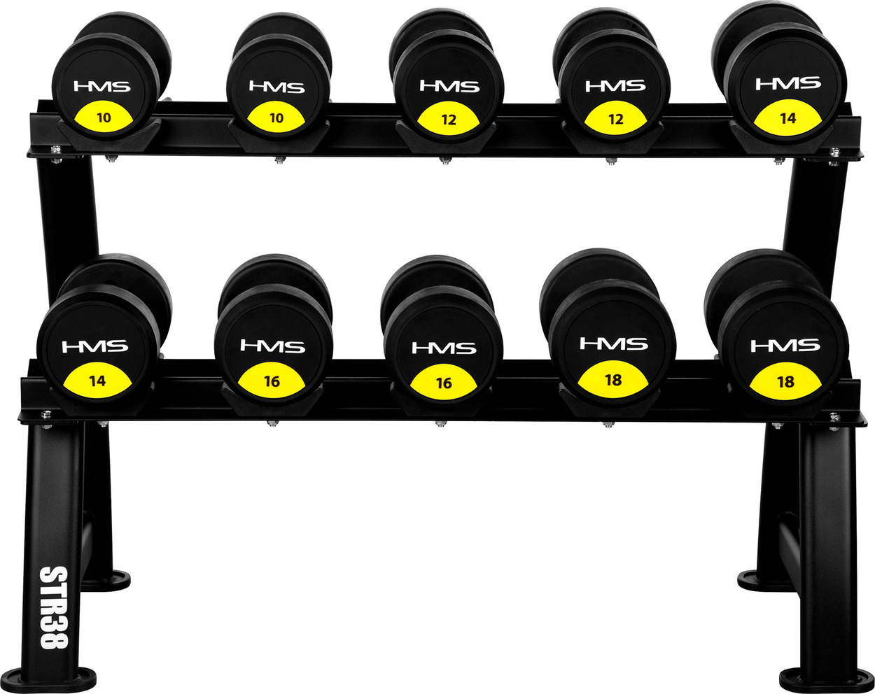 STR38 oferuje dwa poziomy przechowywania, które mieszczą do 10 par hantli.