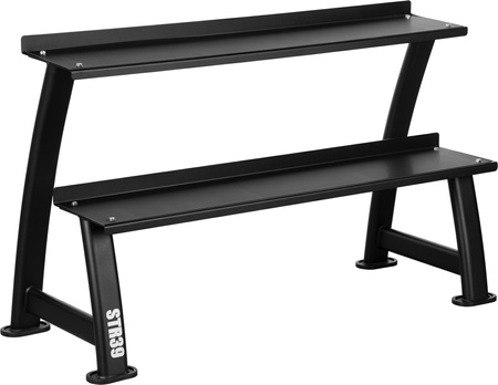 STR39 to solidny, dwupoziomowy stojak na kettlebells od HMS, który pozwala na wygodne i bezpieczne przechowywanie ciężarów do 300 kg.