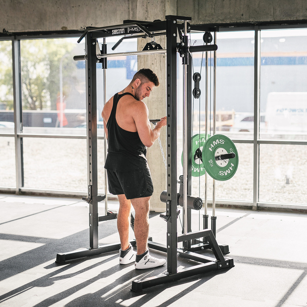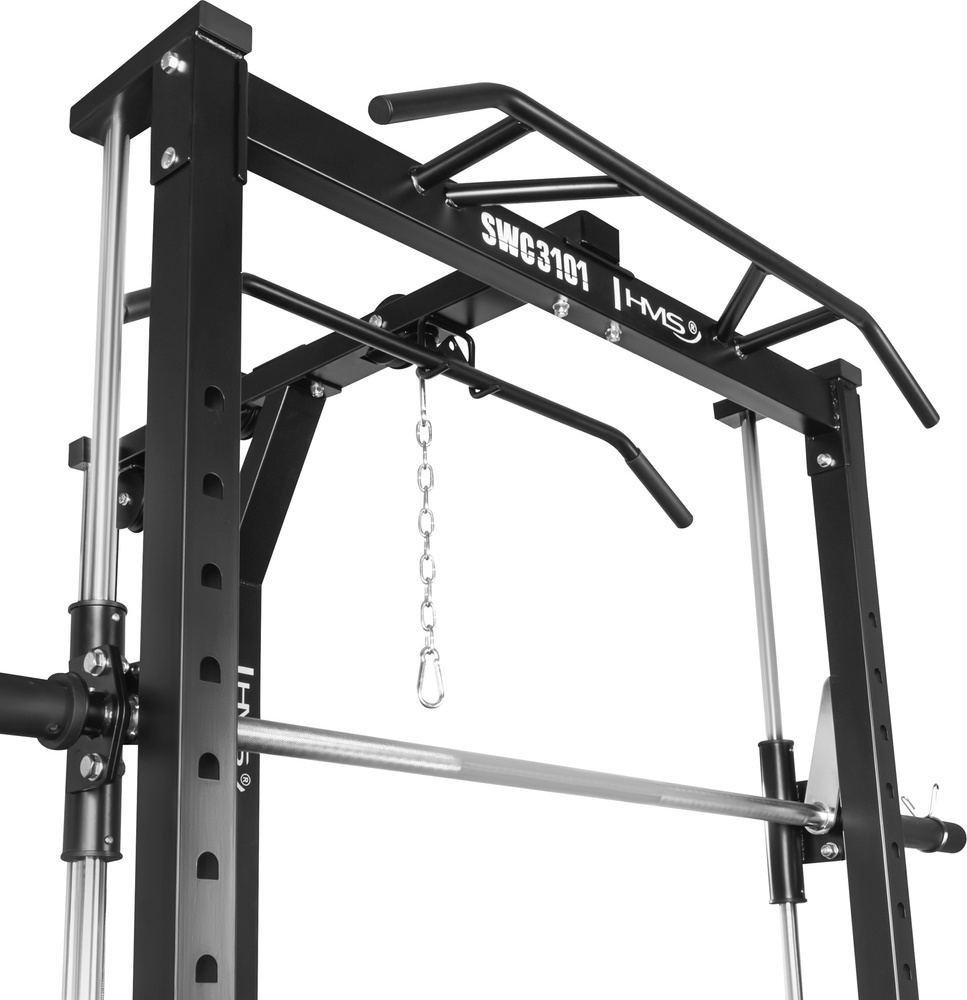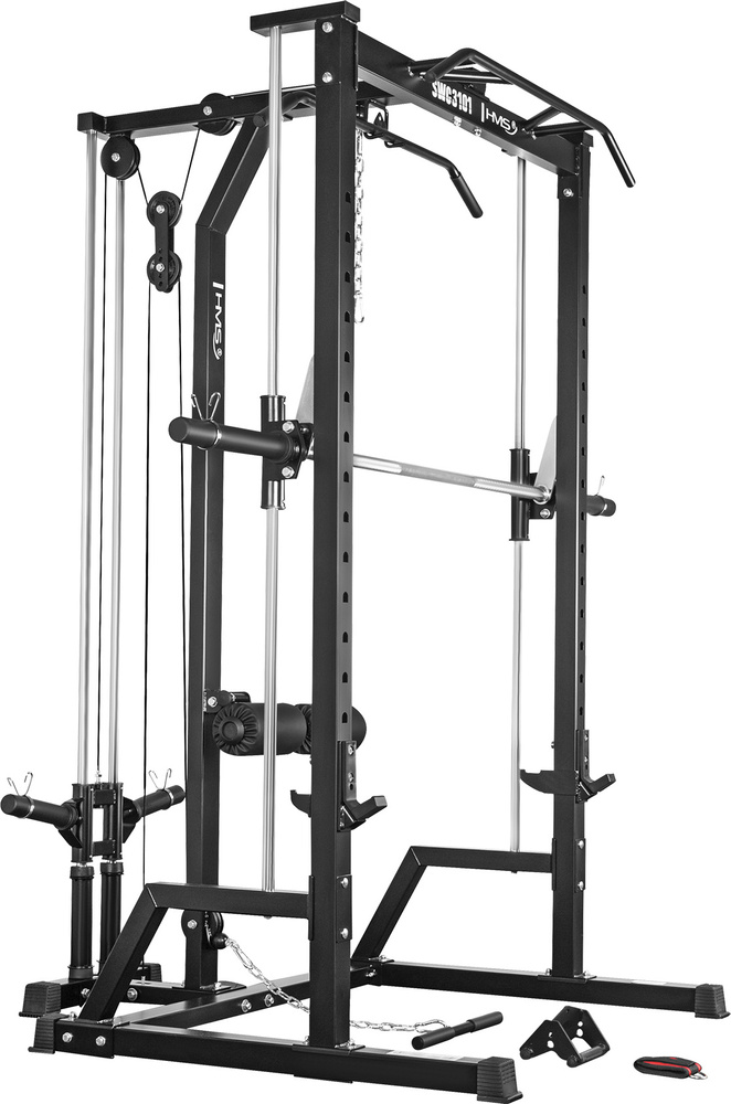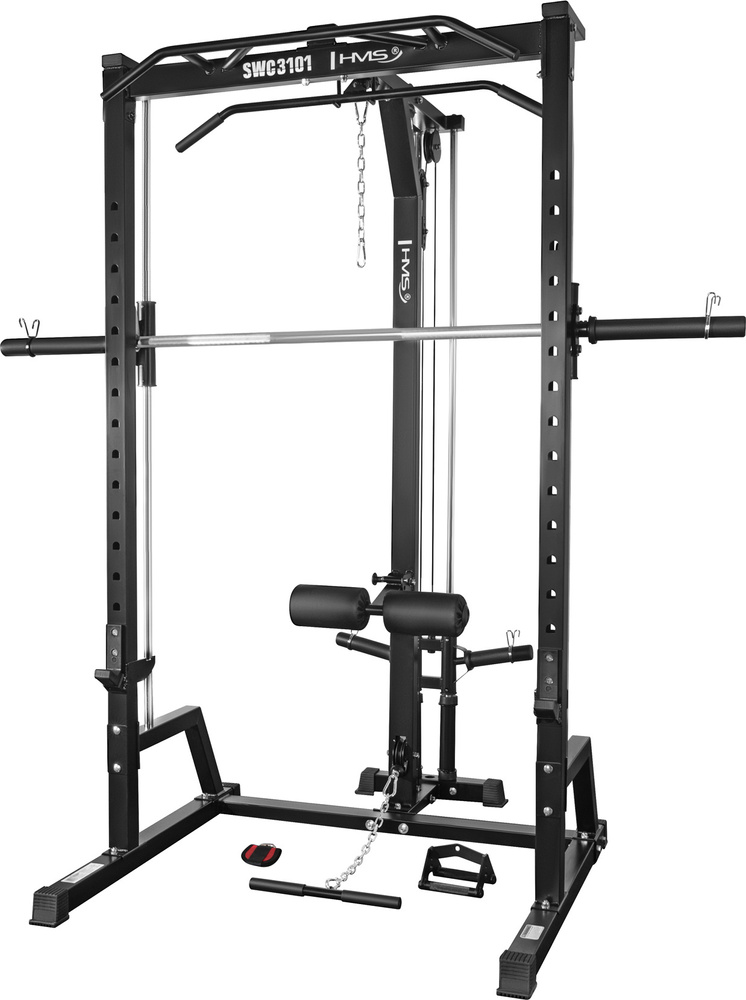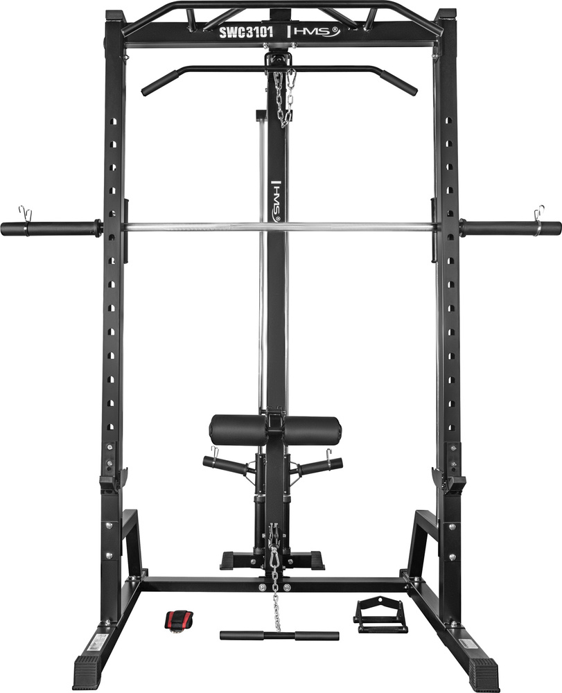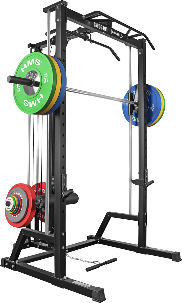 Łącząc suwnicę Smitha, rack treningowy oraz wyciągi o przełożeniu 1:1, SWC3101 od HMS Fitness stanowi kompletną platformę do treningu siłowego i funkcjonalnego.