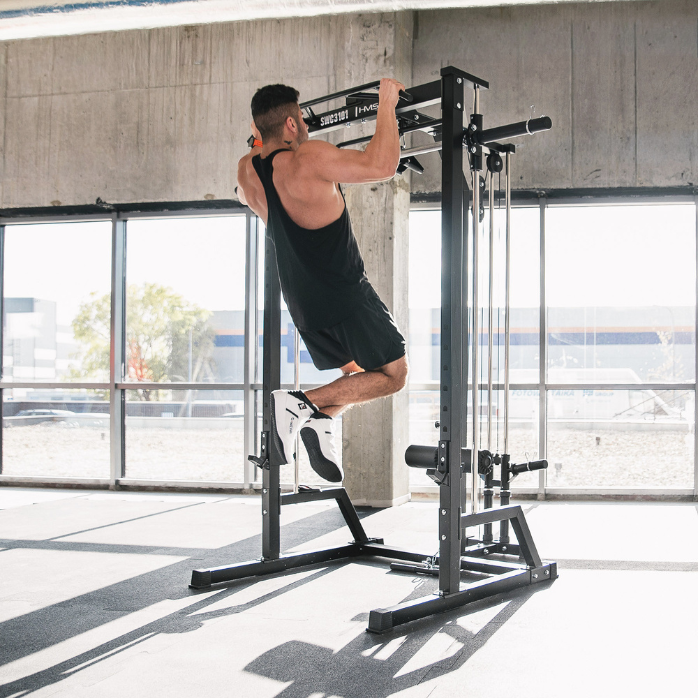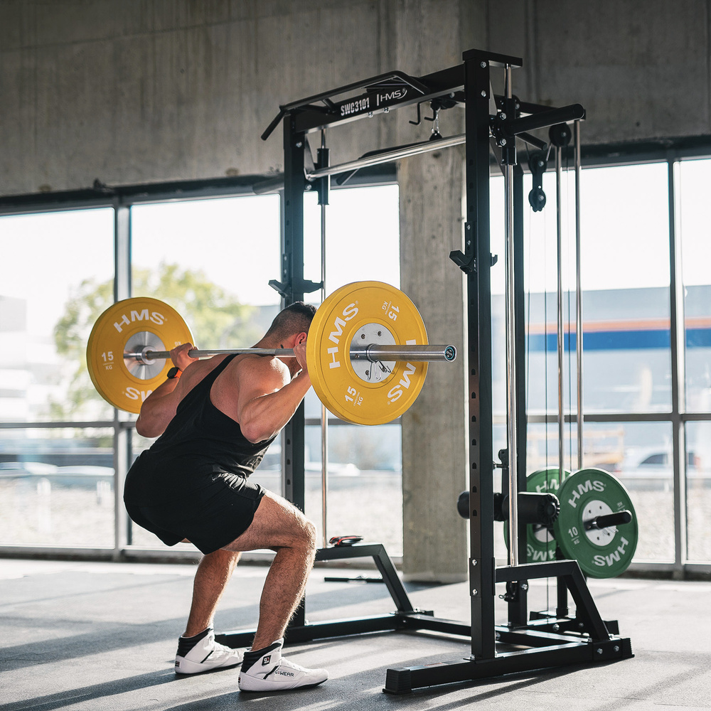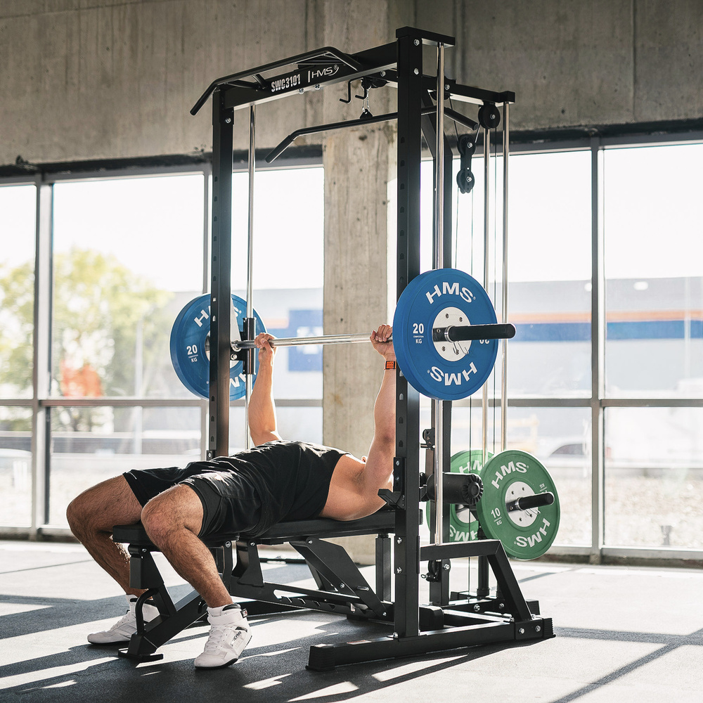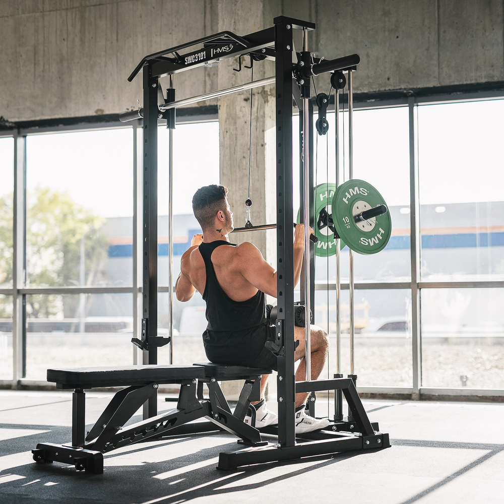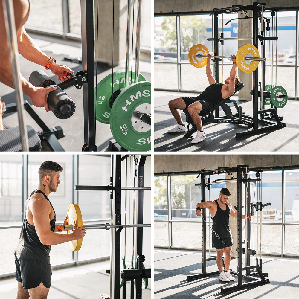 Łącząc suwnicę Smitha, rack treningowy oraz wyciągi o przełożeniu 1:1, SWC3101 od HMS Fitness stanowi kompletną platformę do treningu siłowego i funkcjonalnego.