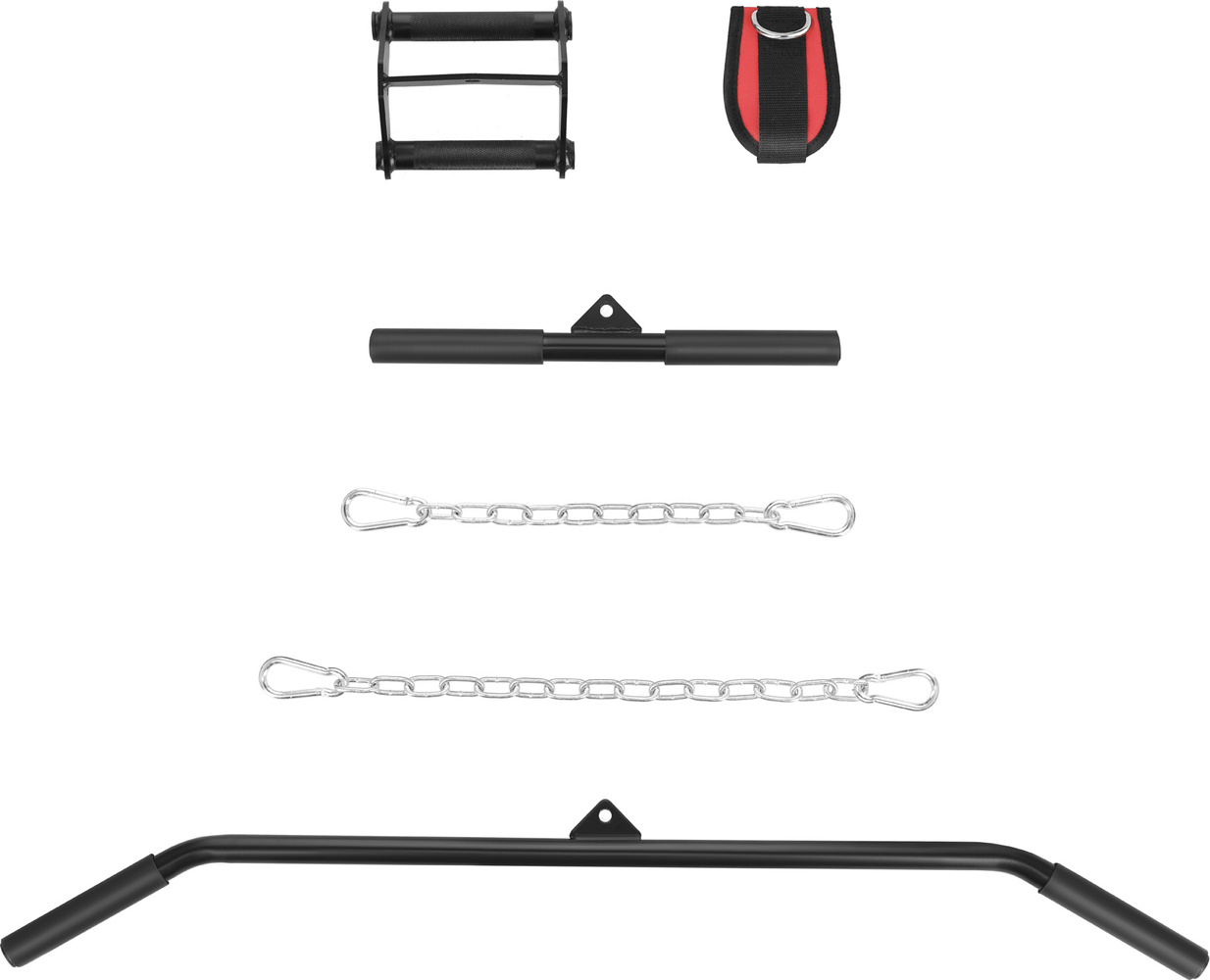 - akcesoria do wyciągu (uchwyt trójkątny, opaska na kostkę i nadgarstek, uchwyt prosty krótki, dwa łańcuchy i długi drążek łamany),