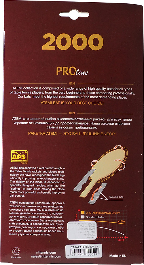 Wysokiej jakości rakietka sprawdzi się zarówno podczas rekreacyjnych rozgrywek jak również w rękach profesjonalisty, rozgrywającego ważny, ligowy mecz. Rakietka do ping ponga New Atemi 2000 Pro oferuje doskonałe parametry gry.