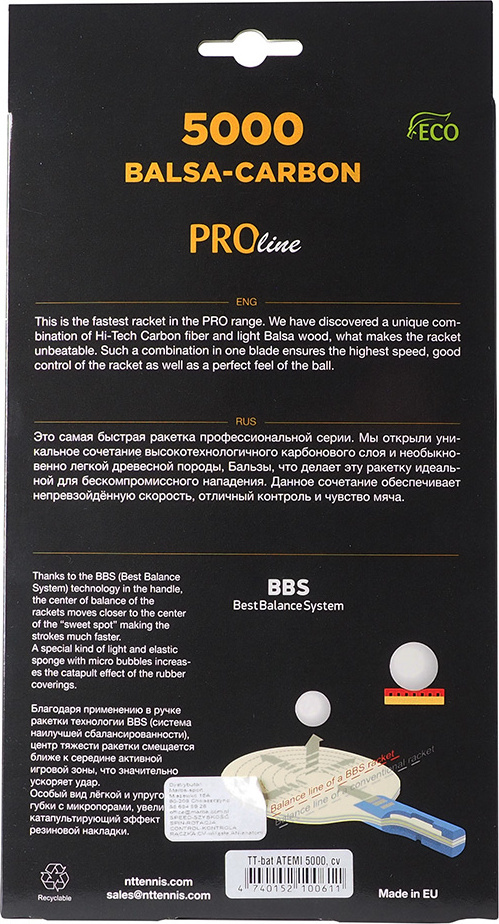 Wklęsły uchwyt concave węższy na środku i nieco szerszy na końcu zapobiega wyślizgnięciu się rakietki z ręki, a podkład o grubości 2,3 mm absorbuje wstrząsy. Rakietka do tenisa stołowego zyskała system BBS ( Best Balance System ) zapewniający doskonałe czucie piłeczki.