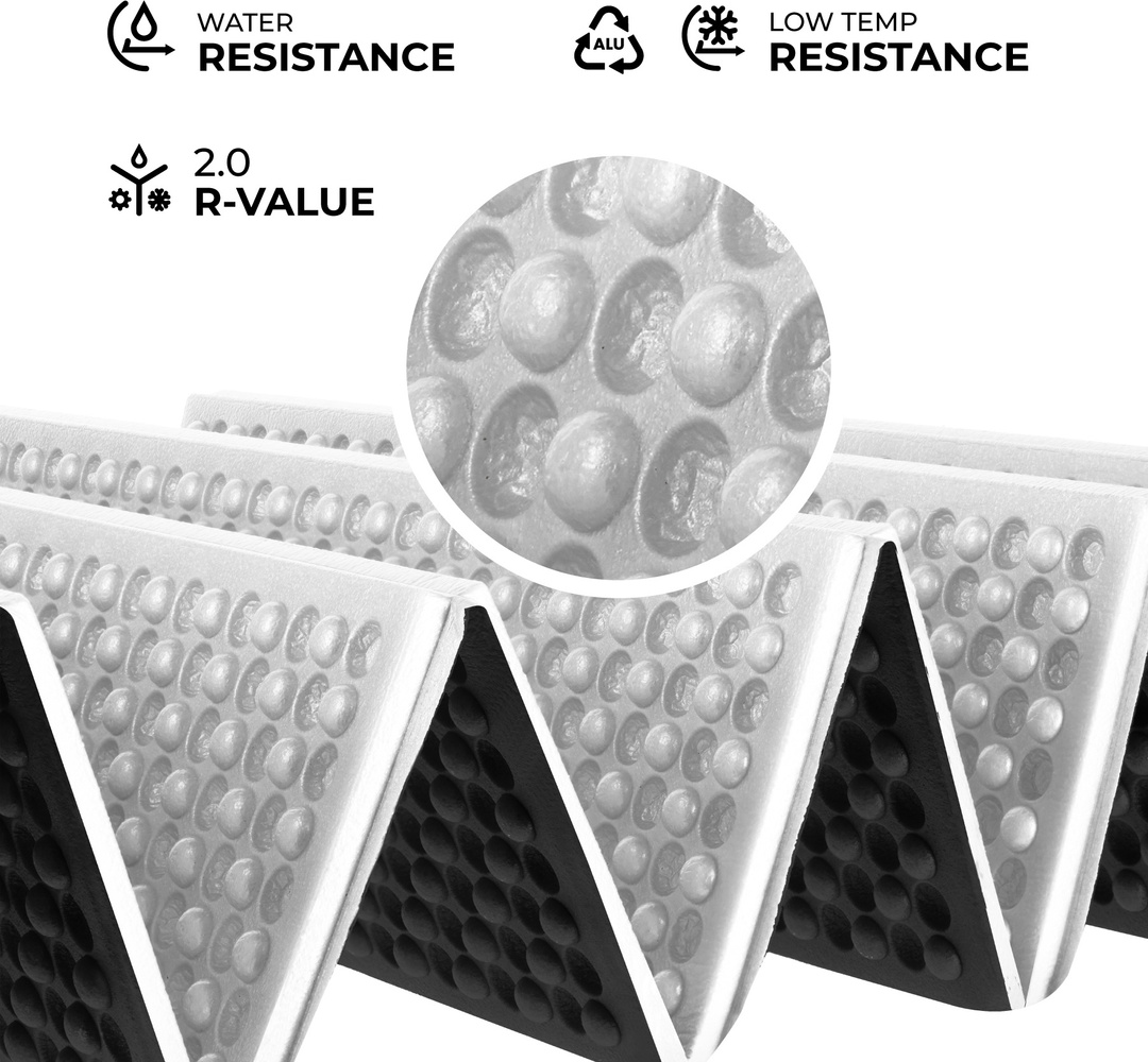 Dzięki właściwościom wodoodpornym zarówno XPE, jak i aluminiowej warstwy, mata nie wchłania wilgoci ani brudu, co ułatwia utrzymanie jej w czystości.