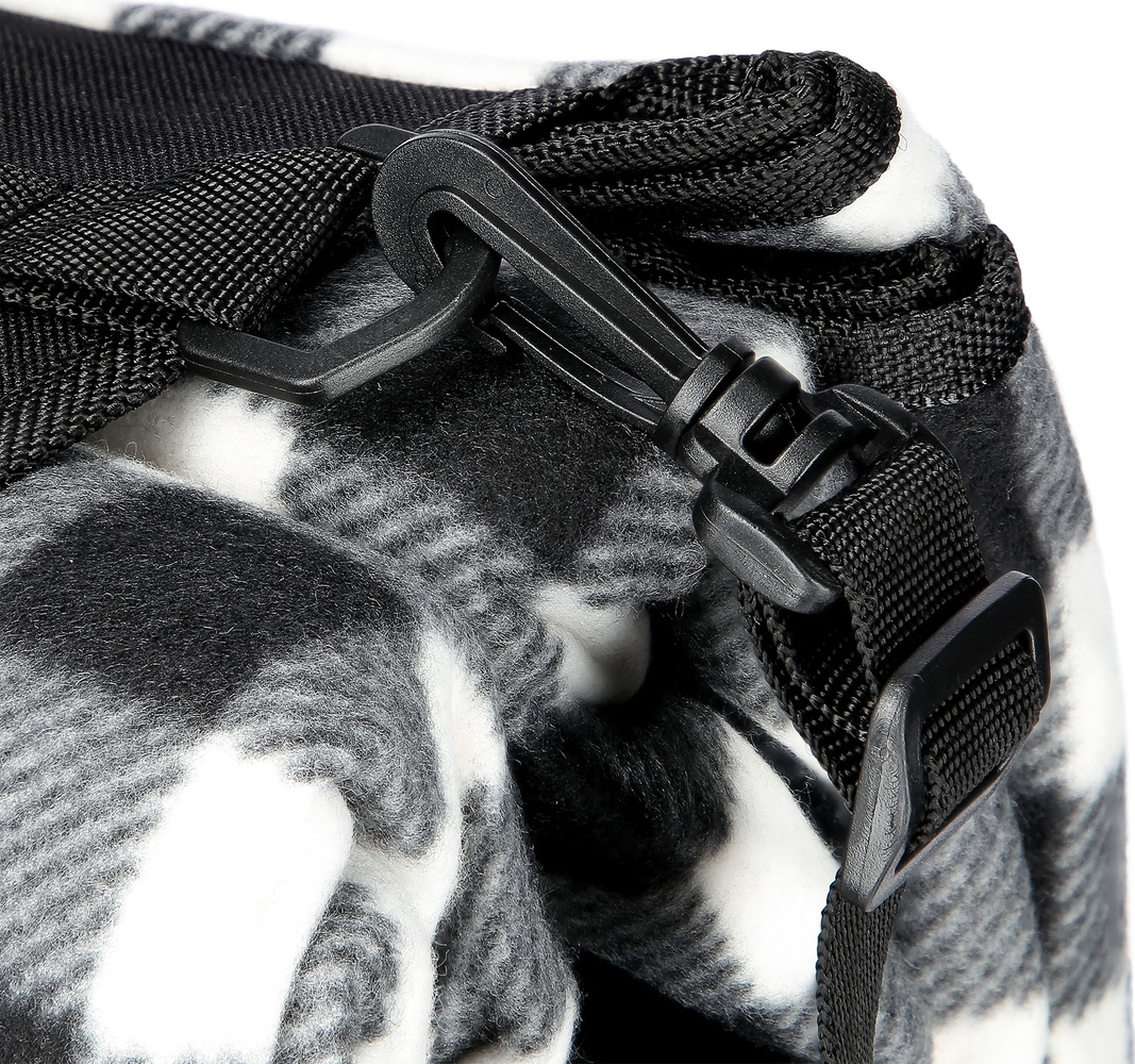 Rzep zabezpieczający zapobiega jego przypadkowemu rozłożeniu, a regulowany pasek z uchwytem pozwala wygodnie przenosić koc jak torbę.