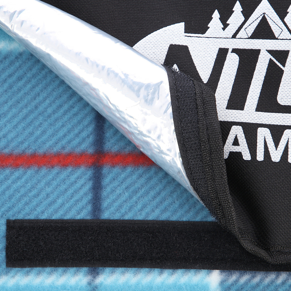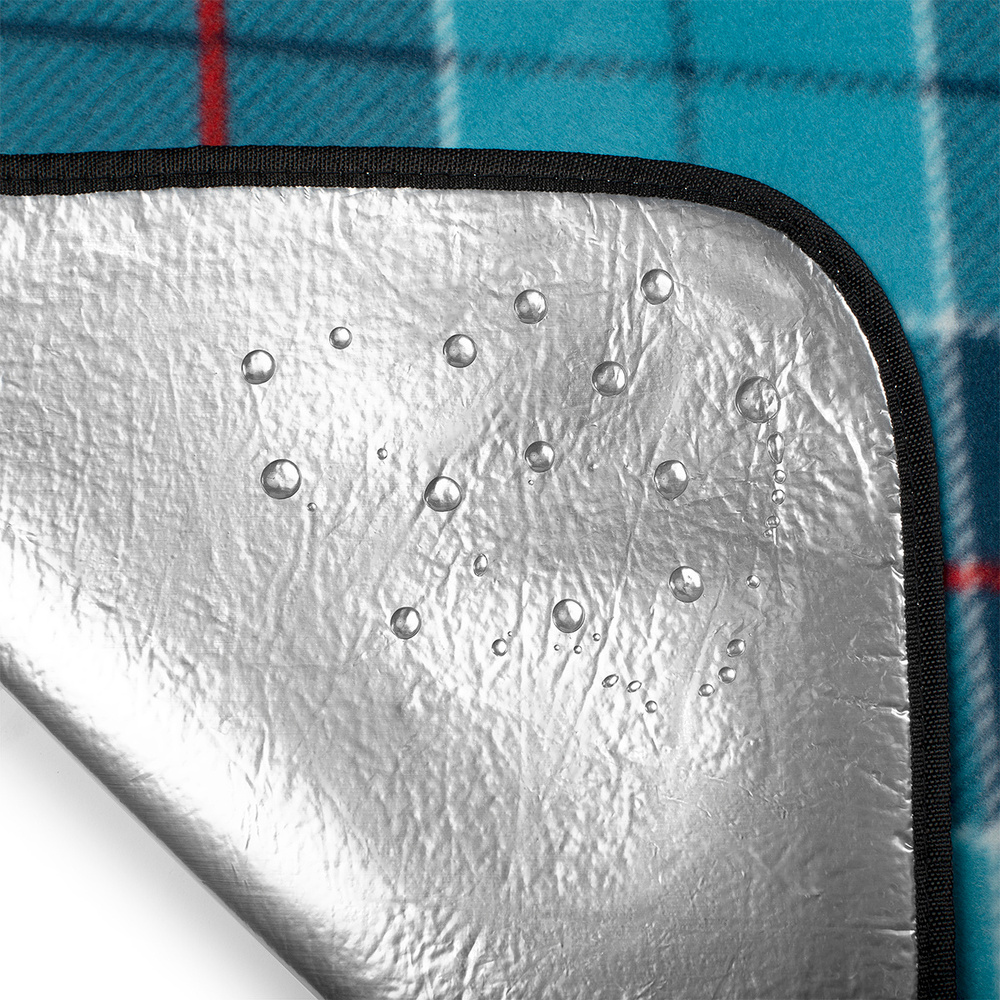 Na dolnej części, umieszczono powłokę aluminium, które jest wodoodporne i pozwala użyć koca np. na wilgotnym piasku, czy trawie pokrytej rosą.