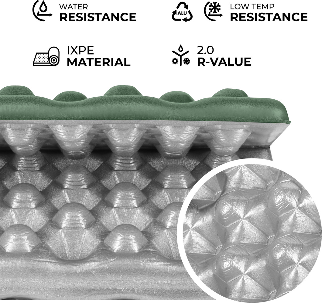 Od spodu mata została wyposażona w warstwę folii aluminiowej, która skutecznie odbija ciepło ciała i zabezpiecza przed zimnem oraz wilgocią.