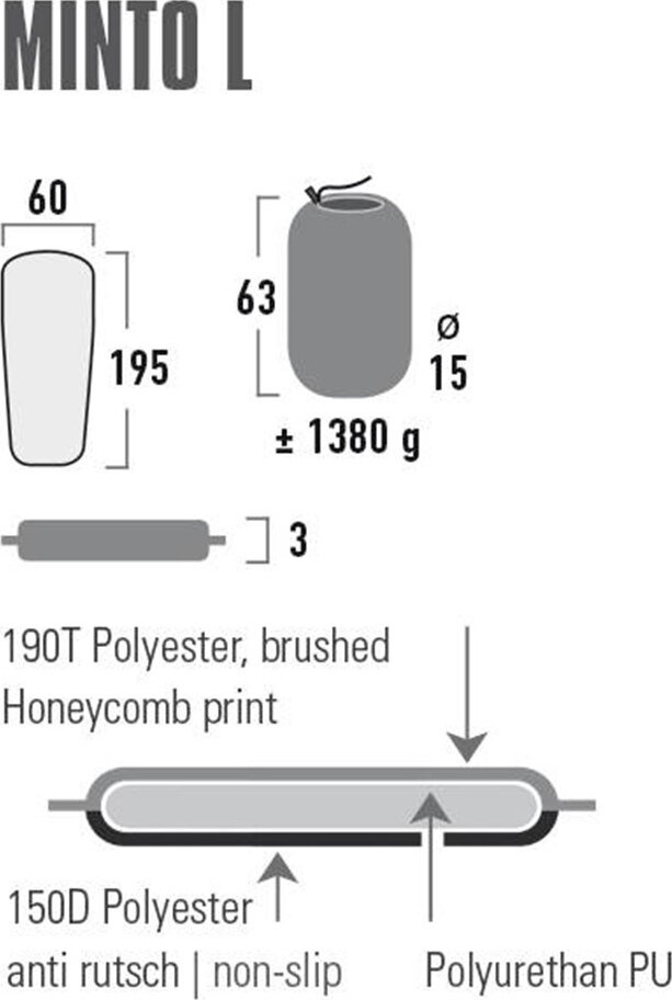 Dane techniczne:·Waga: 1380 g·Wymiary: 195x60x3 cm·Wymiary po zwinięciu: 63x Ø 15 cm·Warstwa górna: 100% poliester 190T·Wypełnienie: 100% poliuretan PU o wysokiej gęstości 19kg/m3·Warstwa dolna: 100% poliester 150D·Laminat: 0,25 mm PCV