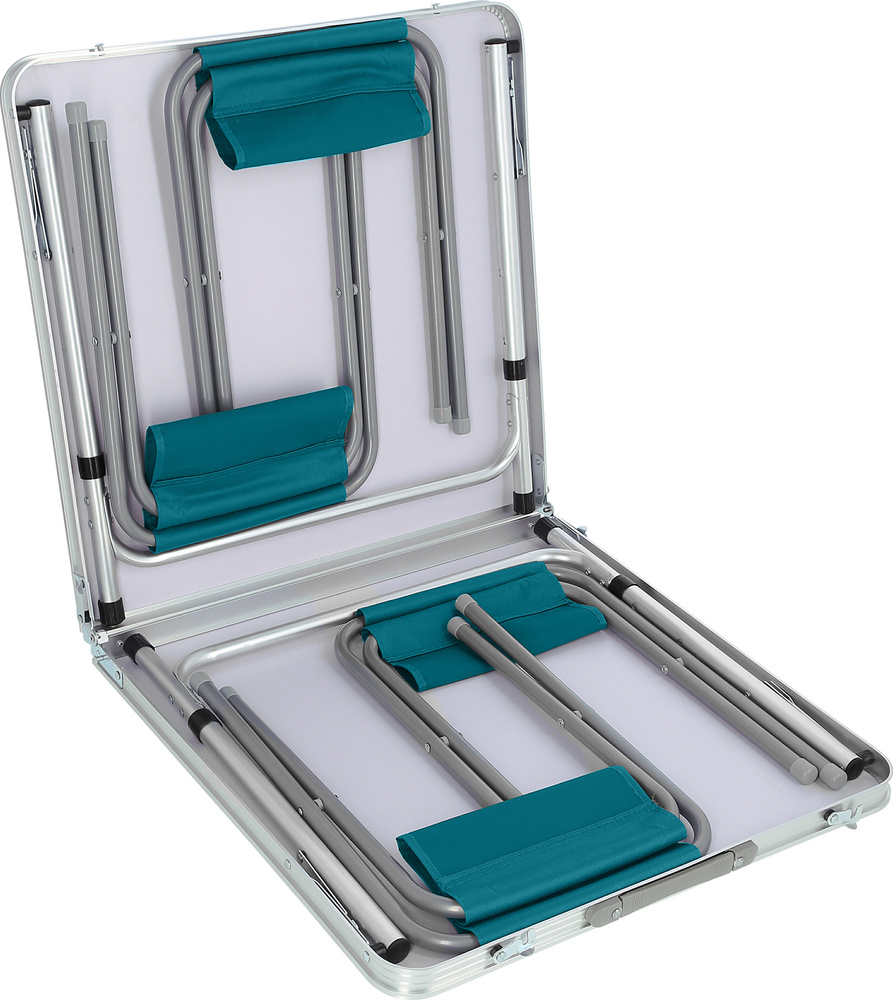 NC1633 składa się jak walizka, krzesła chowamy do środka walizki, a boczna rączka umożliwia wygodne przenoszenie całego zestawu.