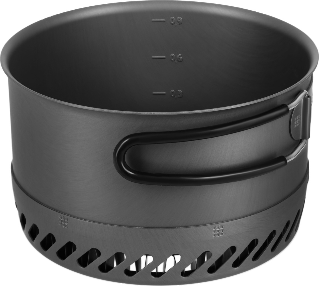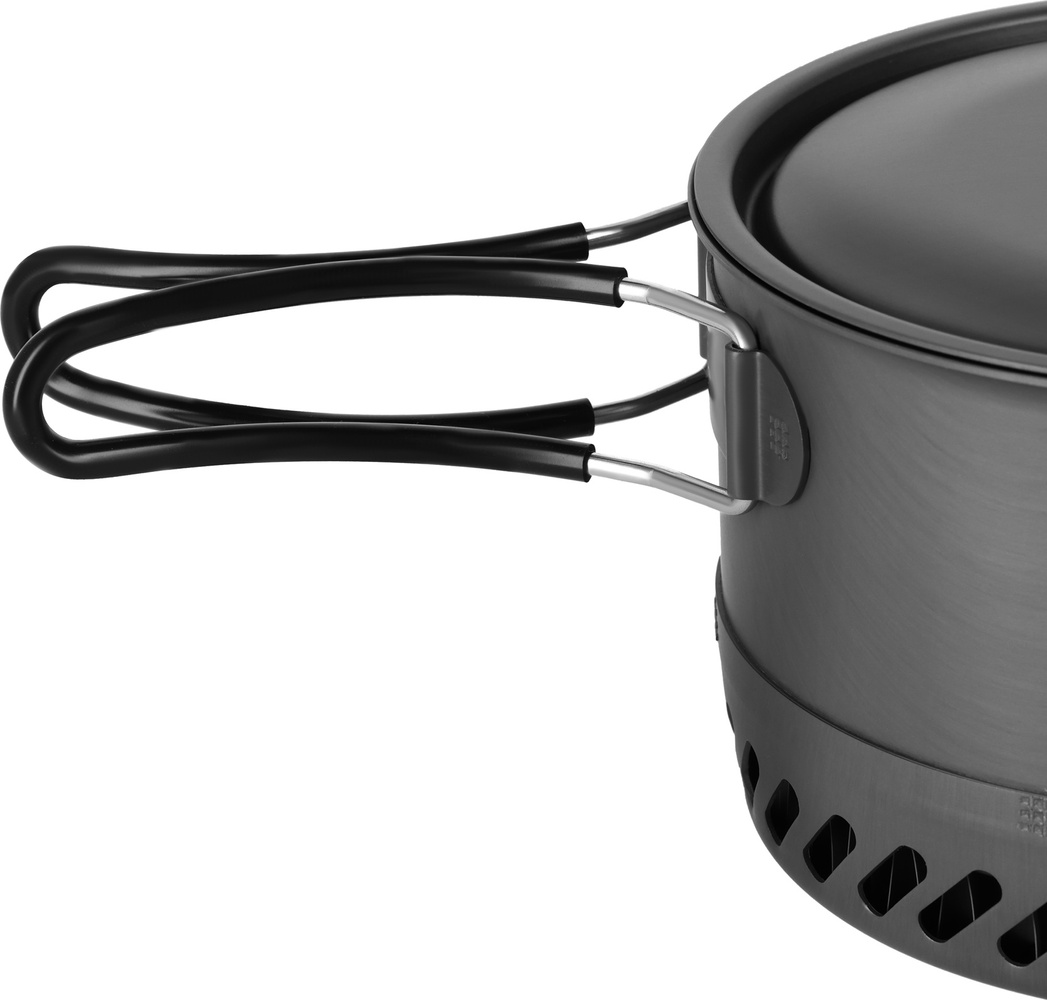 Korpus garnka został wykonany z anodowanego aluminium – materiału, który zapewnia niską wagę i bardzo dobrą odporność na uszkodzenia mechaniczne.