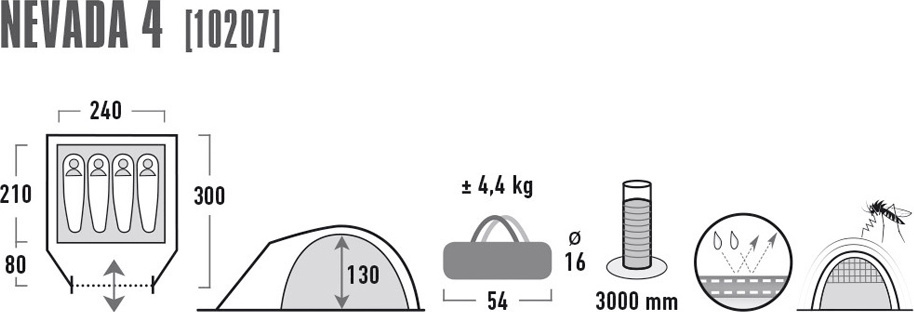 Dzięki podłodze z kolei dyskomfort i ryzyko zaziębienia spowodowanego wilgocią od ziemi jest ograniczone do minimum. W suficie uchwyt umożliwiający podczepienie latarki czy lampy turystycznej. Dane techniczne:· Ilość osób: 4· Wodoodporność: 3000 mm słupa wody· Materiał: tropik –100% poliester PU, podklejone szwy· Stelaż: włókno szklane 8,5 mm/7,9 mm· Wymiary: 210 cm x 240 cm ( + 80 cm przedsionek ), wysokość 130 cm· Wymiary po złożeniu: 54 cm x 16 cm,· Waga: 4,4 kg