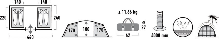 Dodatkową ochronę przed wodą stanowią specjalnie klejone szwy. Dwupowłokowa konstrukcja pozwala na maksymalne odizolowanie sypialni od niewygód świata zewnętrznego – wiatru, wilgoci, owadów oraz w pewnej mierze hałasu. Dwie sypialnie, każda mieszcząca 2 osoby, zapewnią komfort i intymność podczas odpoczynku, a możliwość rozstawienia daszku z wykorzystaniem tropiku z wejścia namiotu pozwala na powiększanie części gospodarczej.