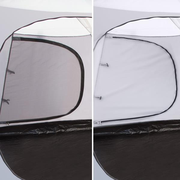 Pierwsze wejście do sypialni znajduje się w przedsionku, natomiast drugie jest z tyłu namiotu, co pozwala na większą swobodę podczas korzystania z namiotu.