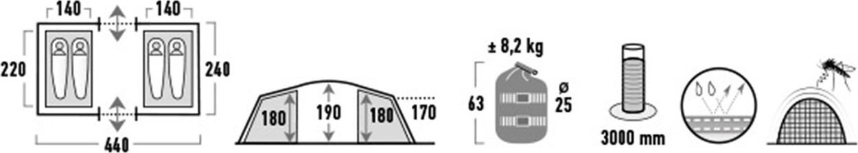 Dane techniczne:·ilość osób: 4·wodoodporność: 3000 mm słupa wody·materiał: poliester 190T·stelaż: aluminium 7001 T6, 11 mm·wymiary: sypialnie pierwsza: 140 x 220 cm, druga: 140 x 240 cm, całość: 440 x 220/240 cm·wysokość: sypialnie: 180 cm, przedsionek 190 cm·wymiary po złożeniu: wysokość 63 cm, średnica 25 cm·pokrowiec z paskami kompresyjnymi·waga: 8,2 kg