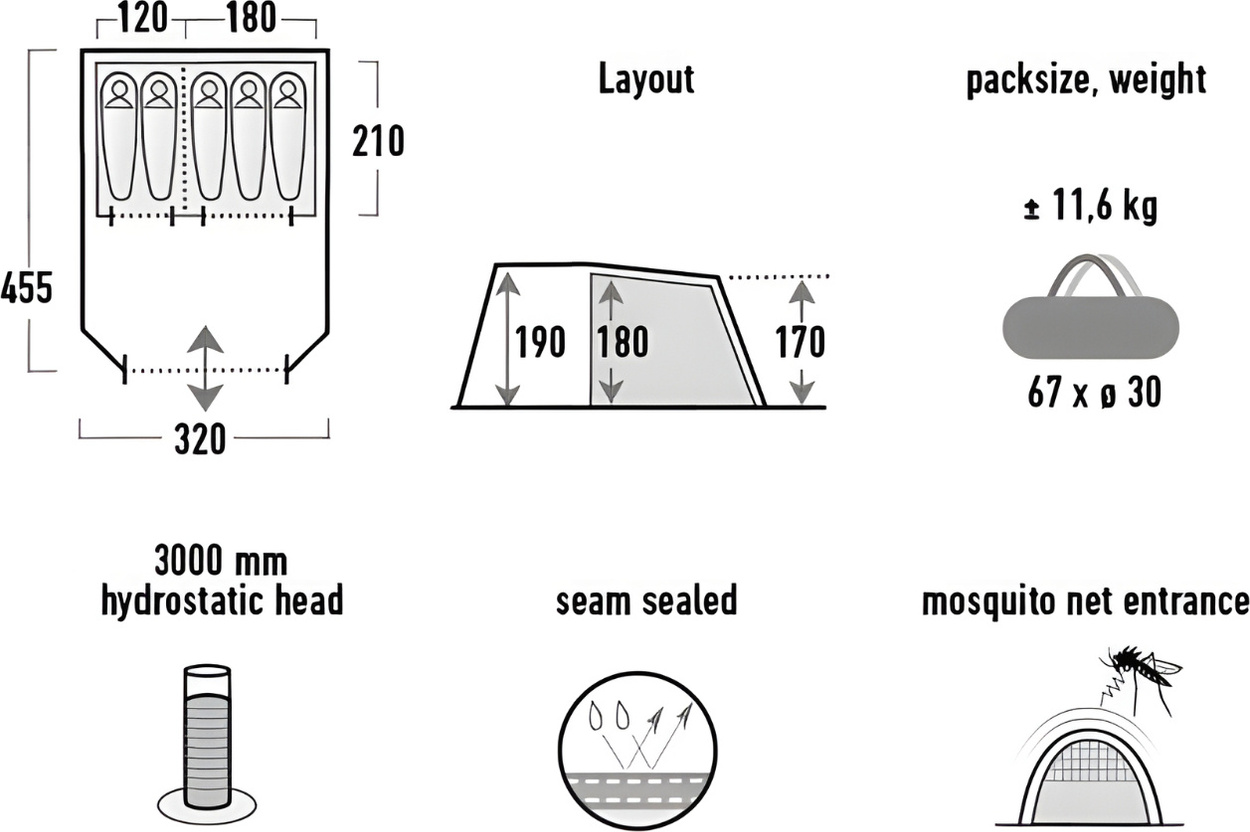 Dane techniczne:· Ilość osób: 5· Wodoodporność: 3000 mm słupa wody· Tropik: 100% poliester, PU, PFC free, podklejone szwy· Sypialnia: 100% oddychający poliester, wejście – mesh· Podłoga: 100% poliethylene (PE), wszyta· Stelaż: włókno szklane 11 mm· Wymiary: 320 cm x 455 cm· Wysokość: sypialnia 180/170 cm, przedsionek 190 cm· Wymiary po złożeniu: 67x ⌀ 30 cm· Zapinana na zamek torba transportowa, nie zawiera PFC· Trwałe, stalowe kołki o średnicy 5 mm· Uchwyt na lampę· 5 wewnętrznych kieszeni· Regulowane paski napinające· Kolorowo oznaczone słupki· Zapinane na zamek wejście na kabel· Waga: 11,6 kg