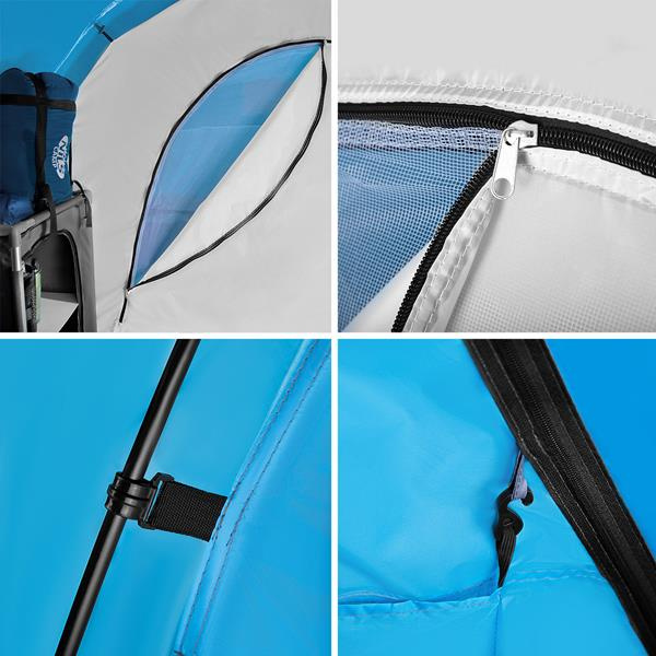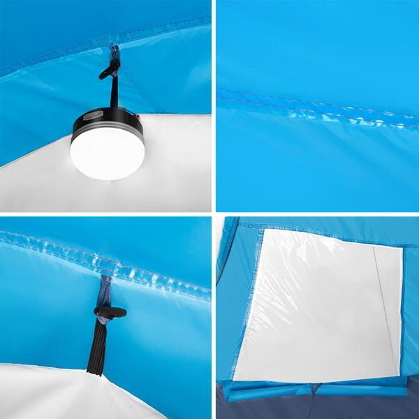 Dodatkowo namiot jest wyposażony w dwie wewnętrzne kieszenie, w których schowamy podręczne rzeczy oraz uchwyt pod sufitem, dzięki którym możemy zawiesić lampkę.
