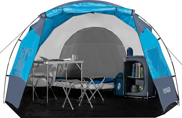 Namiot Voyager oprócz przestronnej sypialni posiada również duży przedsionek z podłogą o wymiarach 230cm dł. x 260cm szer. x 150cm wys., dzięki czemu będąc wewnątrz namiotu można swobodnie spędzać wieczory lub deszczowe dni oraz przechowywać przez noc meble campingowe lub sprzęt campingowy.
