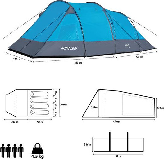 Namiot turystyczny kempingowy voyager Nils camp NC3027 niebieski 4 osobowy 450x260x150cm