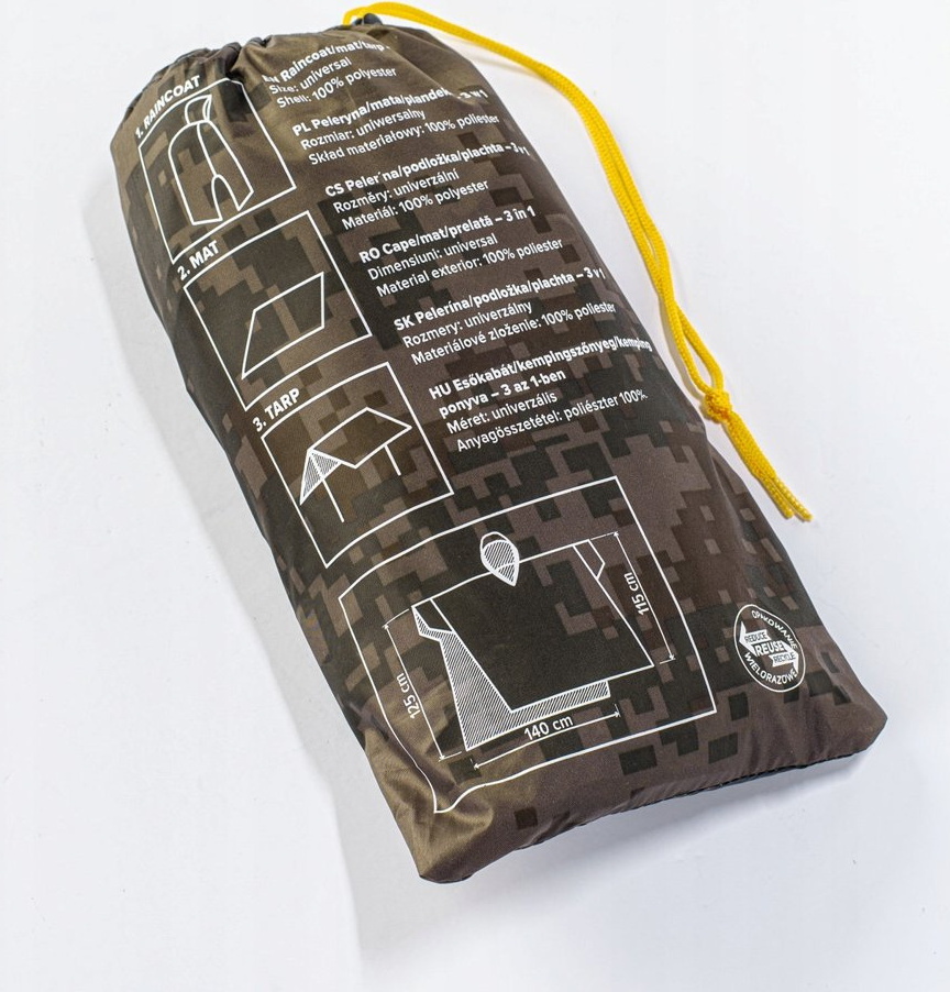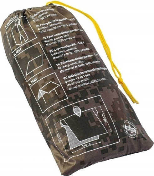 Zalety produktu Dołączony pokrowiec Peleryna, pałatka i mata w jednym Metalowe oczka na rogach do wykonania namiotu Obszerny krój umożliwia zakładanie peleryny z plecakiem na plecach Doskonale chroni przed deszczem Łatwa kompresja do niewielkich rozmiarów Kaptur wyposażony jest w sznurkowy ściągacz.