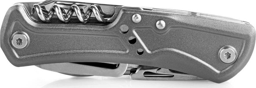 Scyzoryk zawiera w sobie wszystkie najpotrzebniejsze elementy: nóż, nożyczki, piłę, otwieracz do puszek, otwieracz do butelek, płaski śrubokręt, karabinek, korkociąg, śrubokręt stożkowy.