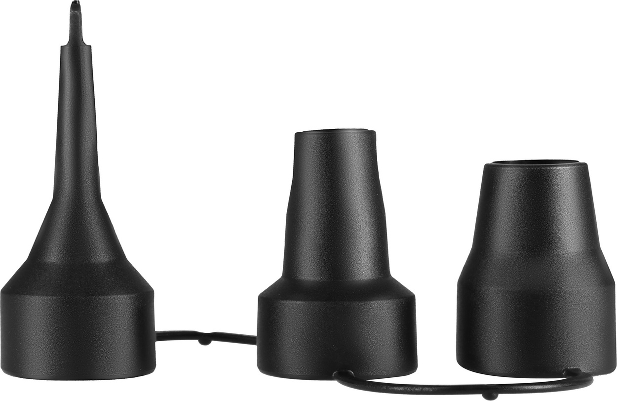 W zestawie znajdują się 3 uniwersalne przejściówki, dzięki którym pompka jest kompatybilna z większością zaworów stosowanych w materacach, pontonach i innych akcesoriach dmuchanych.