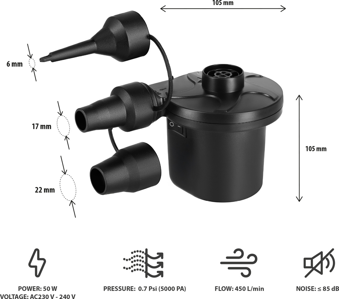 Urządzenie osiąga przepływ powietrza na poziomie 450 litrów na minutę, co pozwala błyskawicznie napełnić powietrzem nawet większe akcesoria dmuchane.