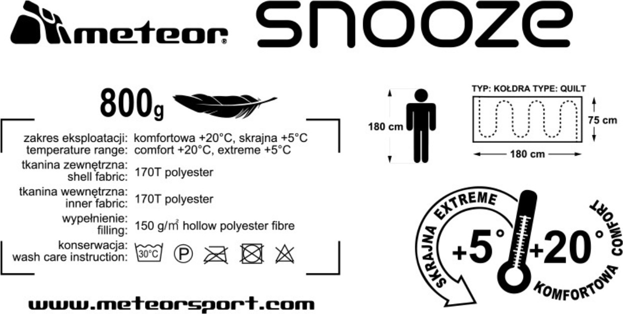 Zabierz ze sobą śpiwór Meteor Snooze i czuj się ciepło, jak we własnym łóżku. Dane techniczne:·Powłoka: 190T polyester·Podszewka: 170T polyester·Wymiary: 180x75 cm·Wypełnienie: 150 g/m² hollow polyester fibre·Zakres temperatur: comfort +20°C, extreme +5°C