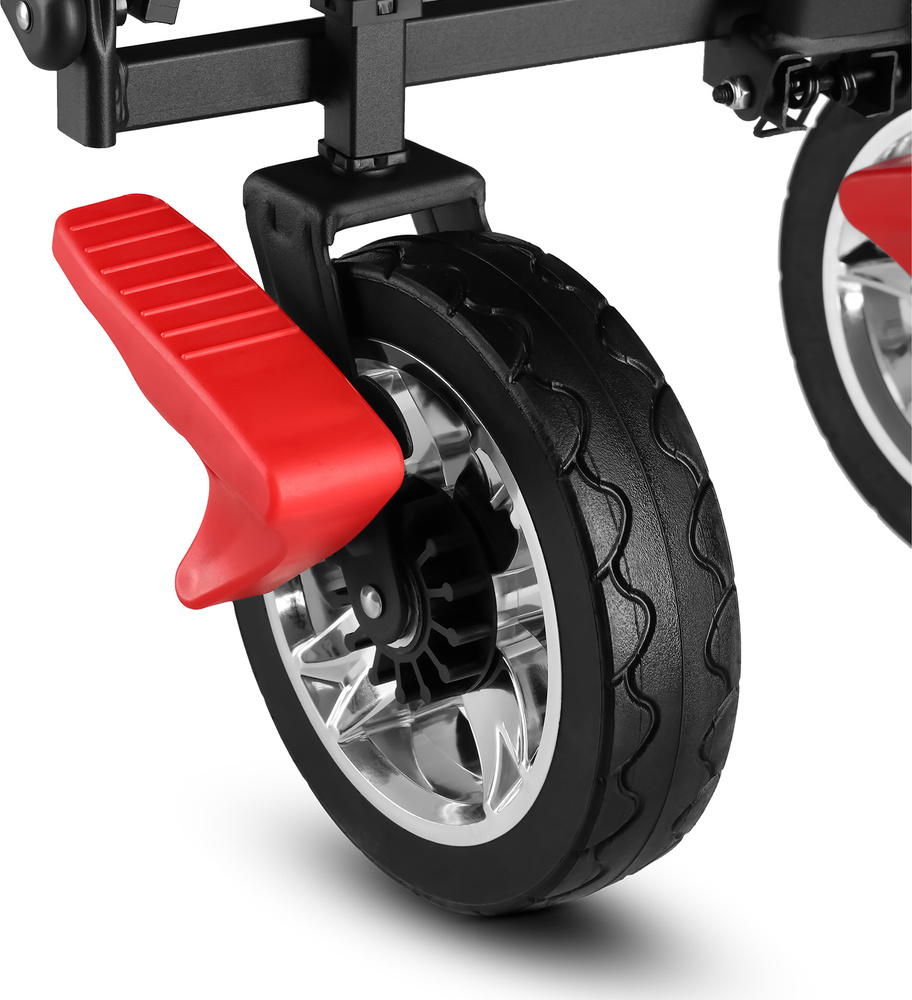 Za płynne prowadzenie odpowiadają cztery solidne koła o wymiarach 8 × 1.75 cala, wykonane z połączenia trwałego tworzywa PP oraz gumy.