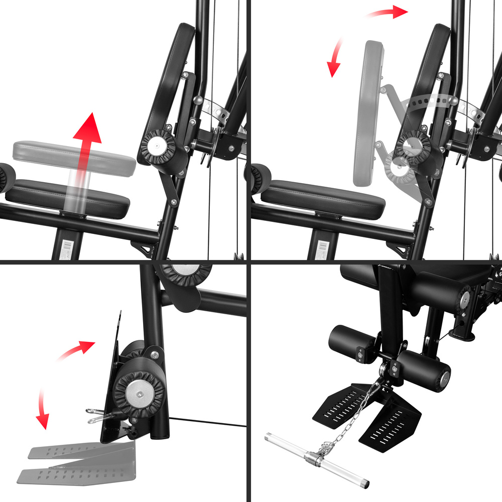- Wielofunkcyjność – wyciąg górny i dolny, ramiona do rozpiętek i wyciskania, stanowisko do wyprostów nóg.